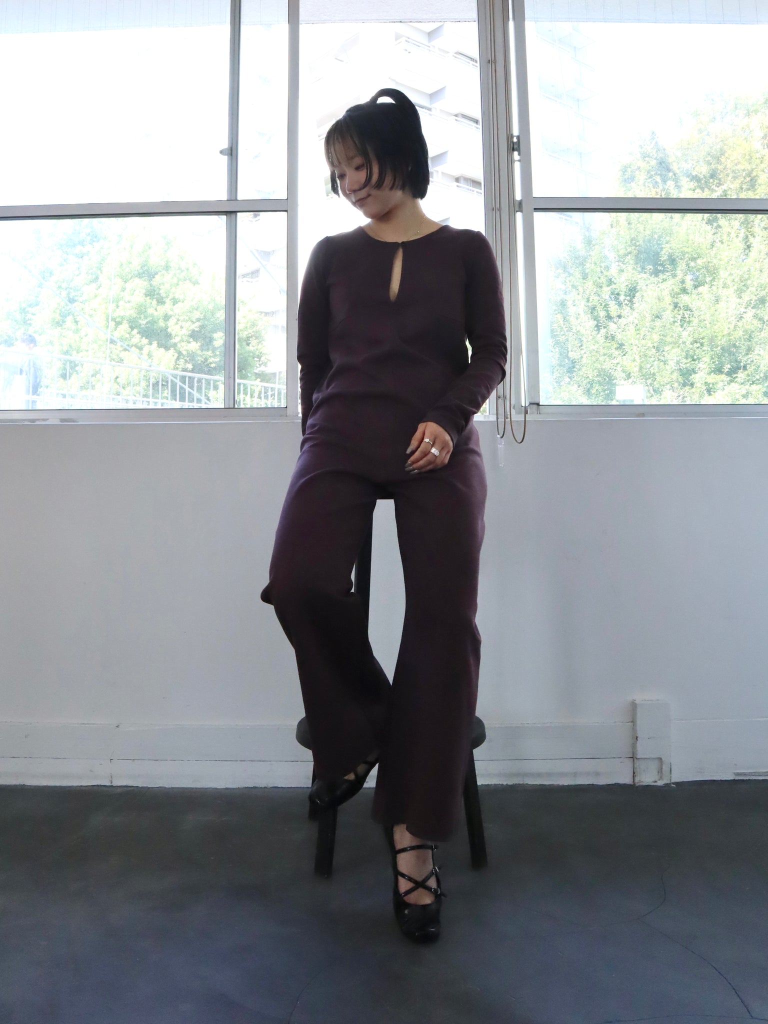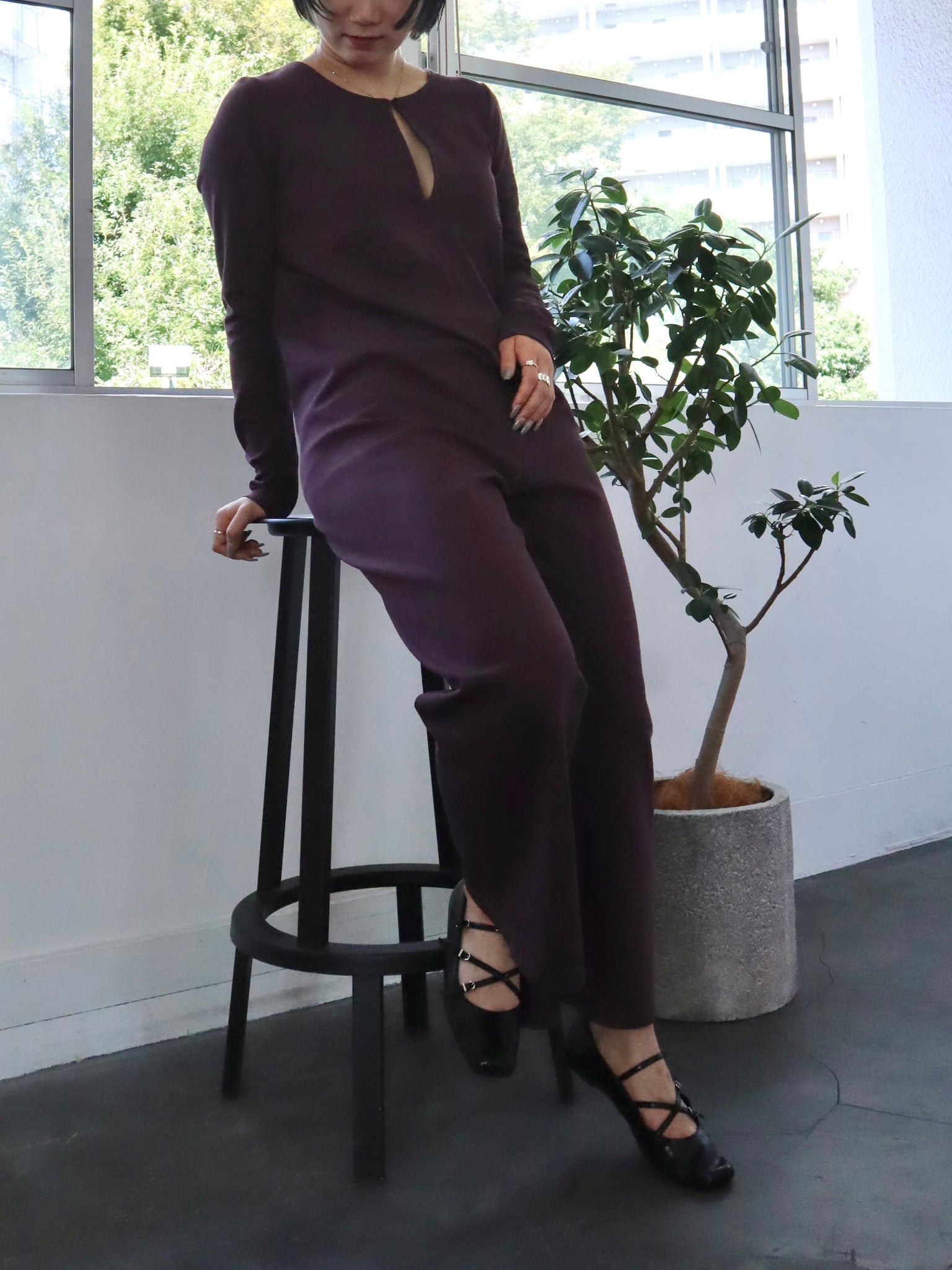胸元のカットアウト部分から、柄物やカラーアイテムを合わせるのも楽しい1着。