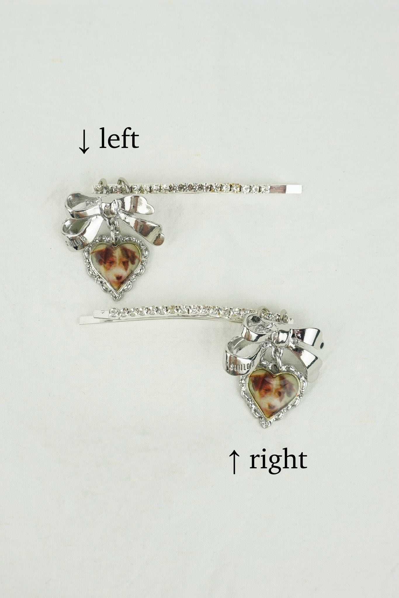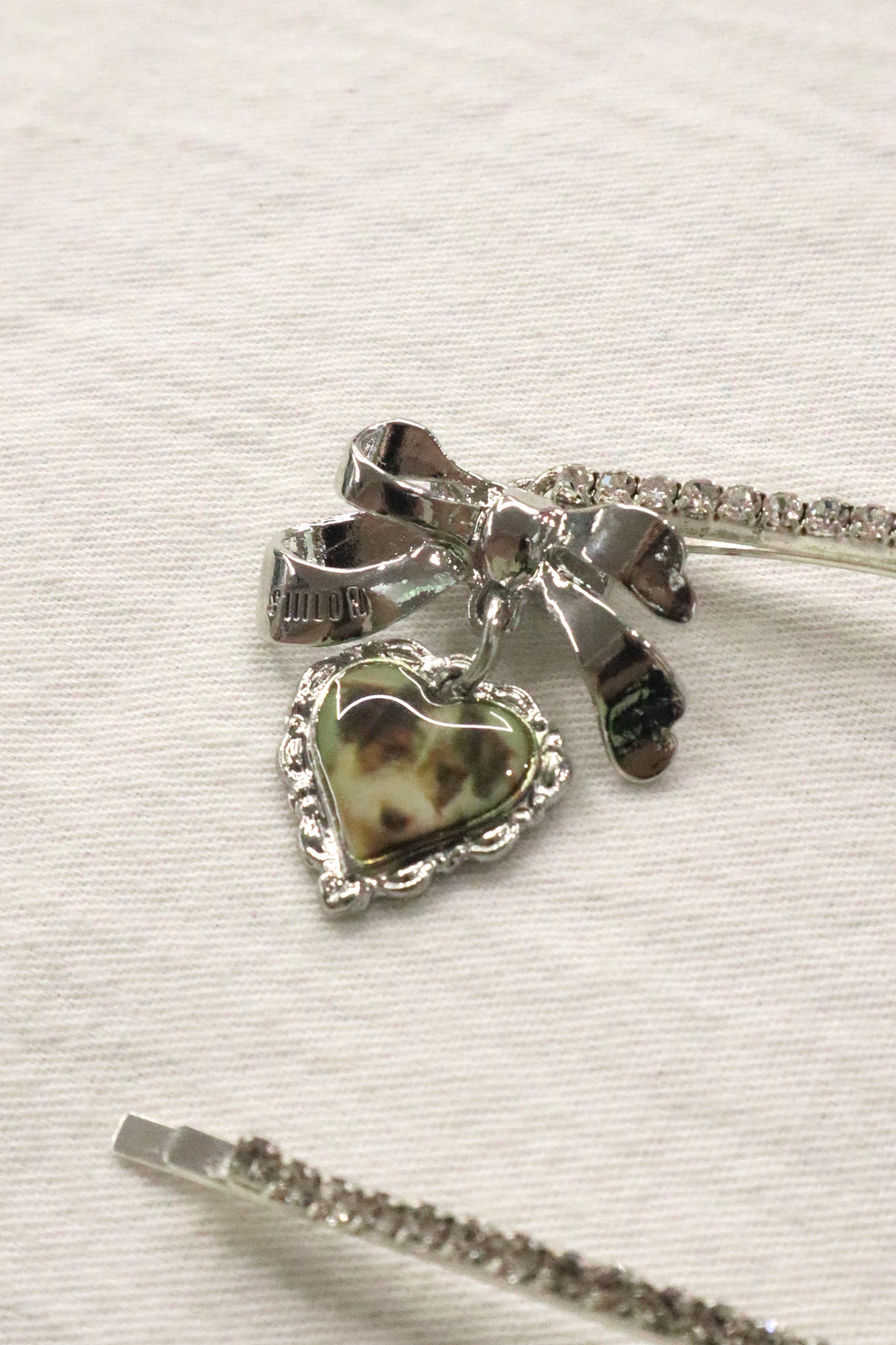 リボンとハートのモチーフが動くたびに揺れる、キュートなヘアピン