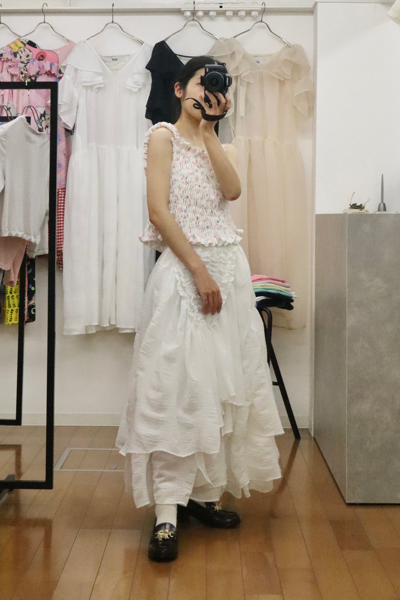 シャーリングと、裾のフリルがコーディネートを華やかに彩ってくれる一点。