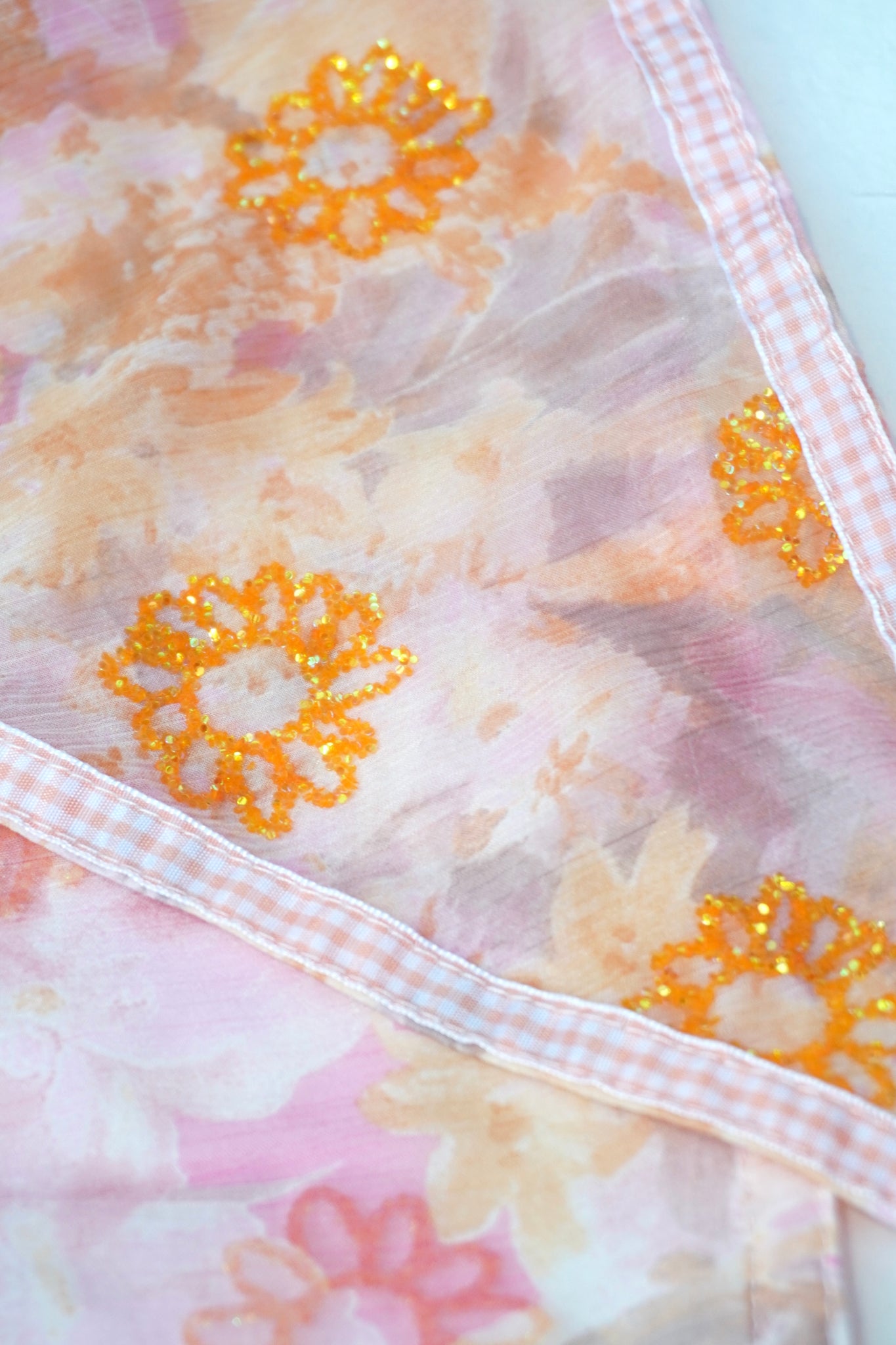 SIIILONオリジナル生地を使用したスカーフ。花柄のシアー生地に、オレンジのラメで型取られたお花がキラキラと輝く特別なスカーフ。